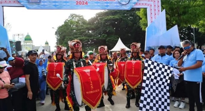 Kegiatan diawali dengan senam, dilanjutkan jalan sehat mengambil rute mengelilingi kawasan eks MTQ diiringi Marchingband TNI 725 Woroagi.