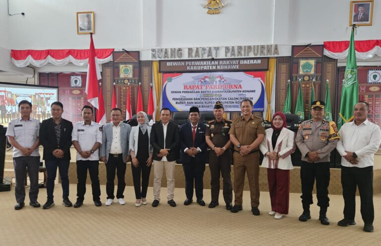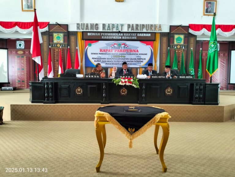 Harianpublik.id,Konawe – Dewan Perwakilan Rakyat Daerah (DPRD) Kabupaten Konawe akhirnya mengesahkan pasangan Bupati dan Wakil Bupati terpilih periode 2025–2030 dalam Rapat Paripurna yang berlangsung khidmat namun penuh makna, pada Senin (13/1/2025). Momentum ini menjadi penanda resmi dimulainya babak baru kepemimpinan Konawe lima tahun ke depan.