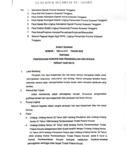 Surat Edaran itu bernomor 100.3.4.1/17 Tahun 2025 tentang Pencegahan Korupsi dan Pengendalian Gratifikasi Terkait Hari Raya. Surat edaran ini ditujukan kepada seluruh jajaran pemerintahan, termasuk Sekretaris Daerah, staf ahli, kepala perangkat daerah, BUMD, serta seluruh pegawai negeri sipil dan PPPK di lingkungan Pemprov Sultra.