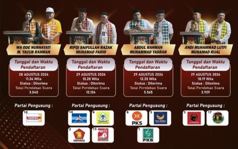 Empat paslon tersebut telah menetapkan visi-misi mereka setelah resmi mendaftar ke KPU Konkep. Keempat paslon yaitu Wa Ode Nuhayati – M. Yacub Rahman, SP; Rifqi Saifullah Razak, ST – Muhamad Farid, SE; Abdul Rahman, SE,. M.A.P – H. Muhammad Yasran, S.Sos; dan H. Andi Muhammad Lutfi, SE,. MM – H. Muhamad Rijal, S.IP,. M.Si.